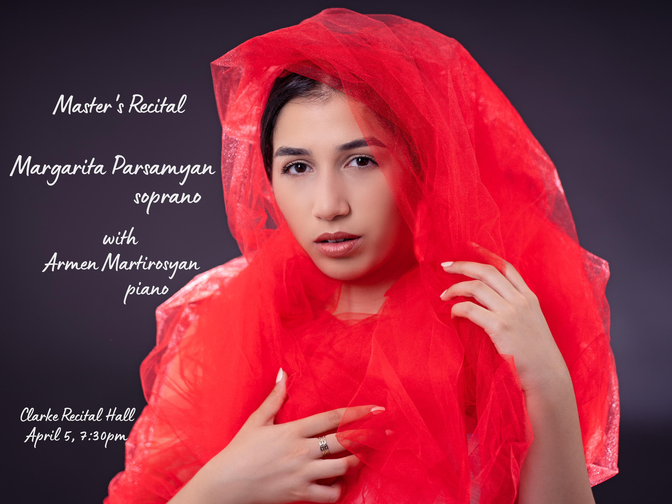 Margarita presents her Master’s Recital in collaboration with Armen Martirosyan (piano). The recital will include the most beautiful…